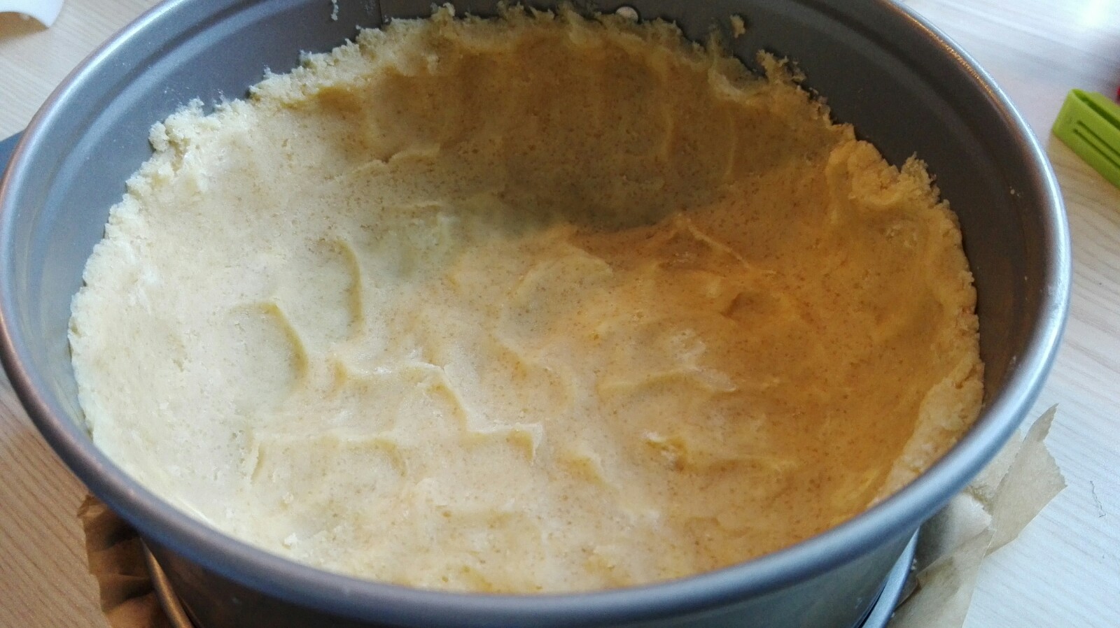 Streuselteig in die Form drücken und dabei einen ca. 1,5 cm hohen Rand bilden.