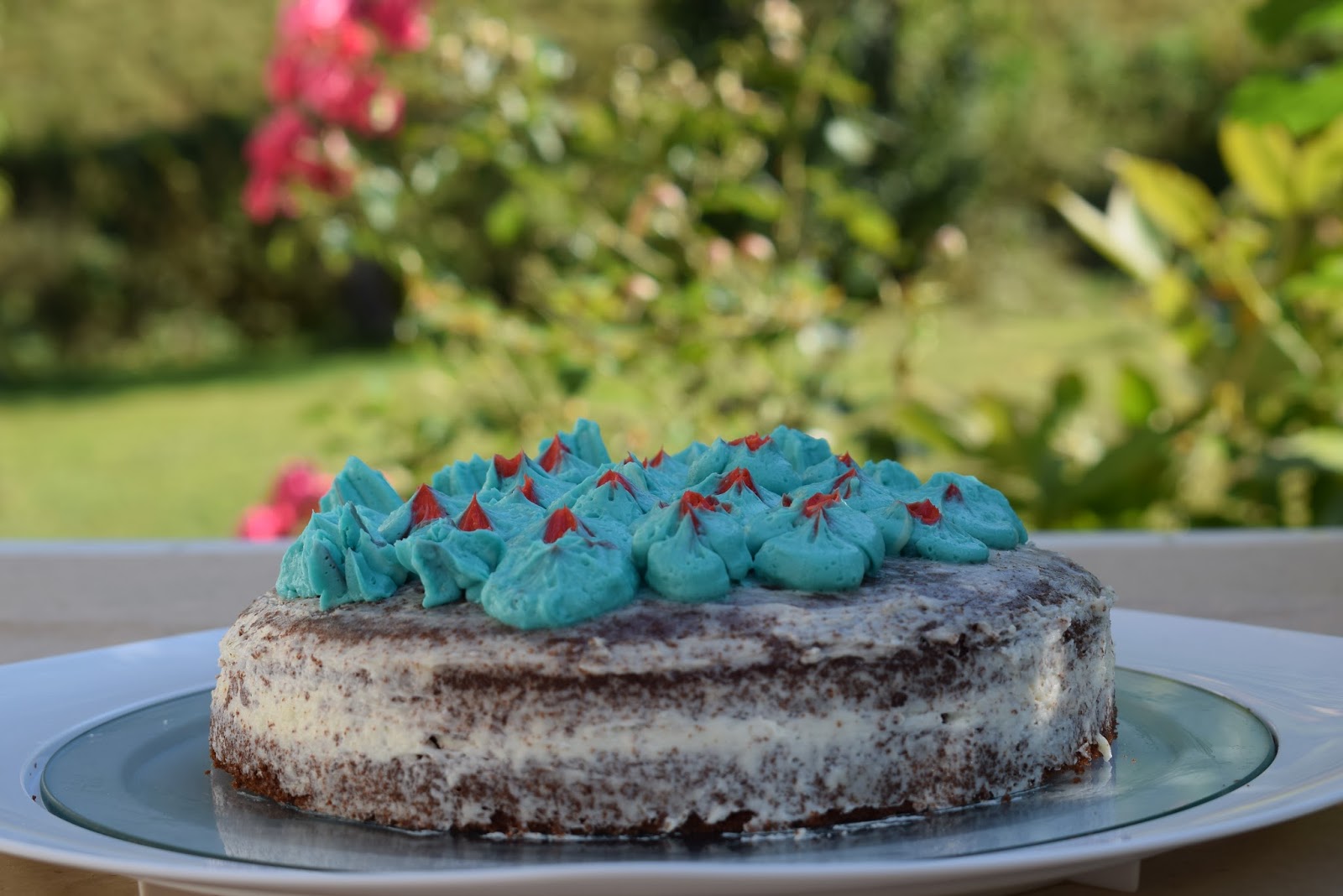 Nachdem ich mich für eine Naked Cake Variante entschieden habe, den Kuchen dünn mit der Buttercreme einstreichen. Jetzt können Verzierungen jeder Art vorgenommen werden. Bei einem klassischen Kuchen hätte ich jetzt kleine Tuffs auf die Torte gemacht und diese mit Kirschen dekoriert. Aber da ich ja meine russischen Spritztüllen probieren wollte, habe ich dies diesmal weggelassen.