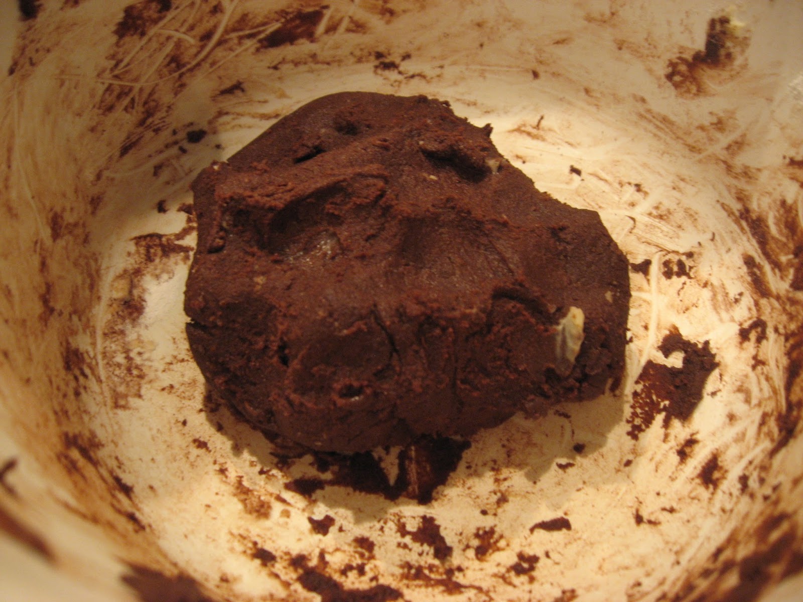 Nun Kakao und Mehl dazugeben und alles zu einem glatten Teig verarbeiten.