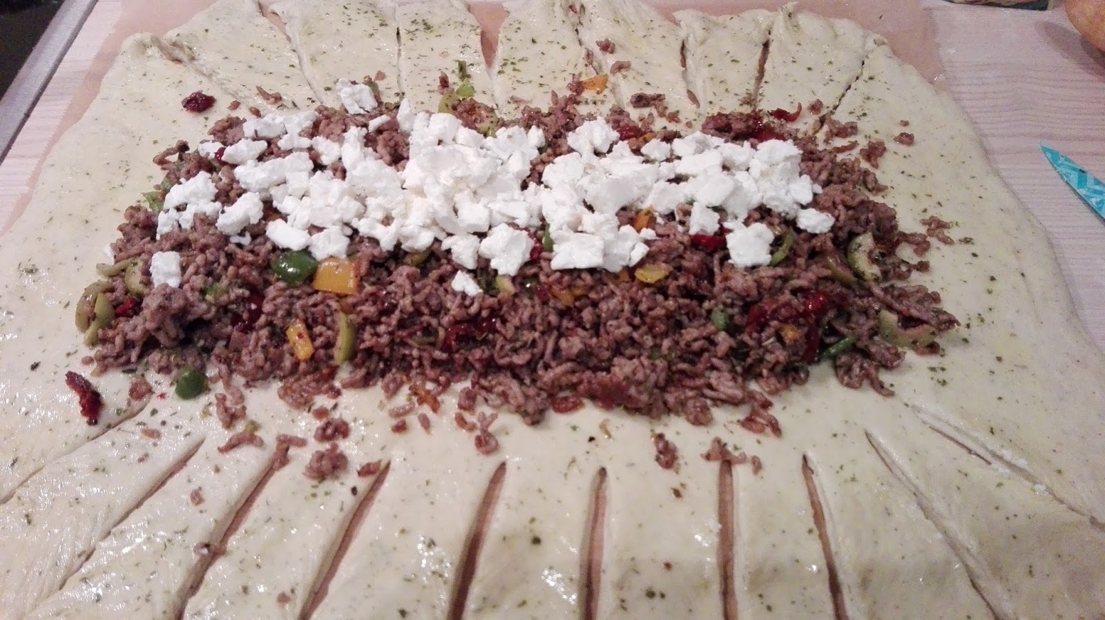 Nun den in Würfel geschnittenen Feta darauf verteilen.