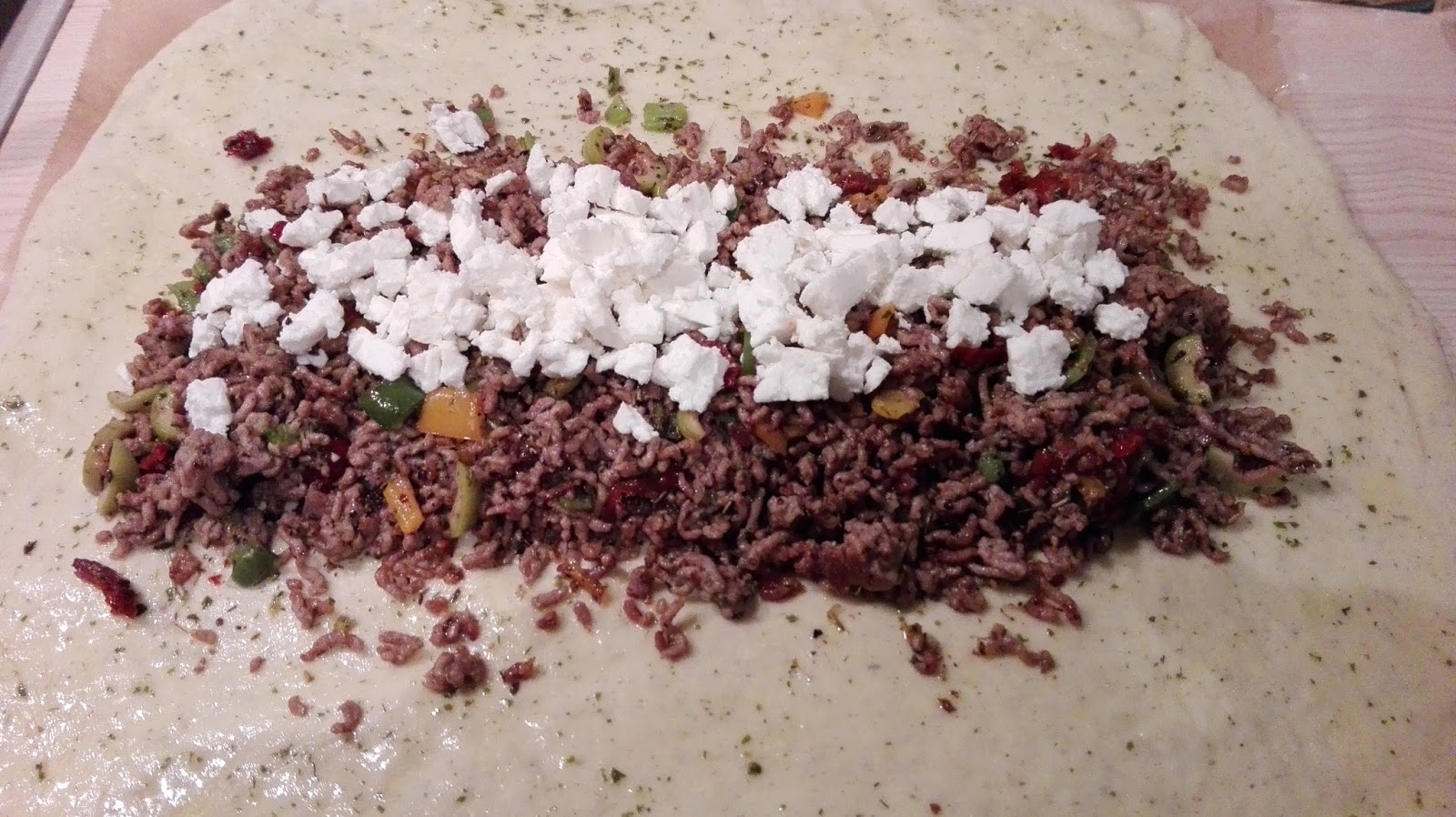 Die Füllung nun Mittig auf den Teig geben.