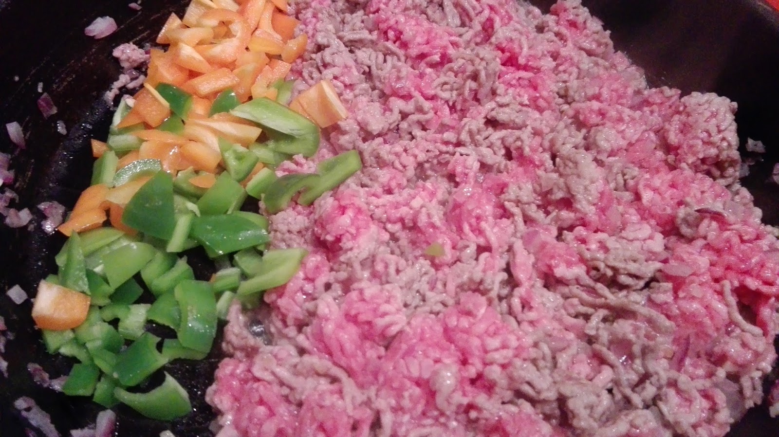 Wenn das Hackfleisch etwas angebraten ist, das Gemüse dazugeben und mit anbraten und mit Salz, Pfeffer und Gewürzen abschmecken.