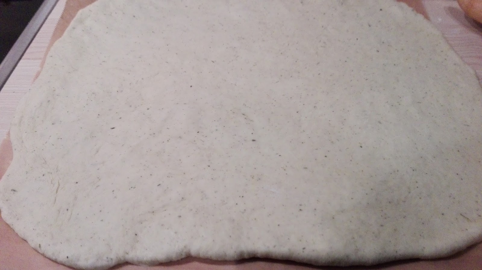 Teig nochmals kurz durchkneten und dann auf einem Backpapier zu einem Rechteck ausrollen.