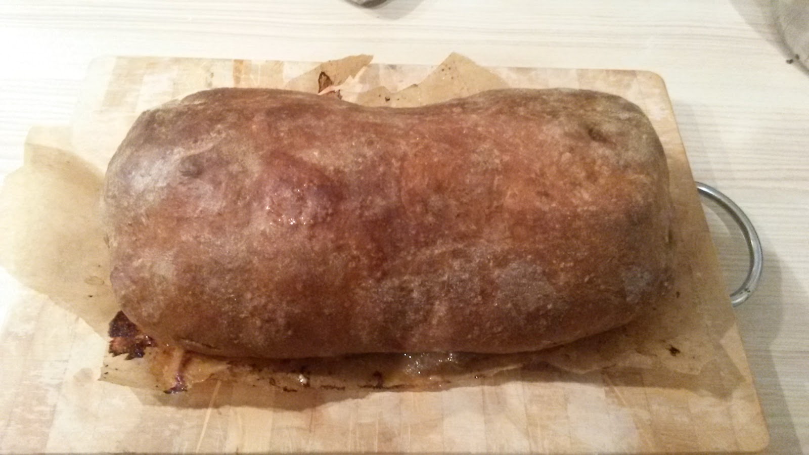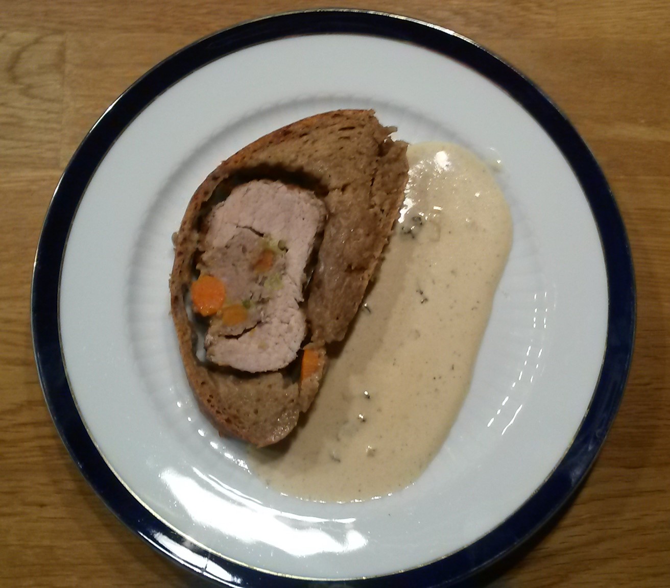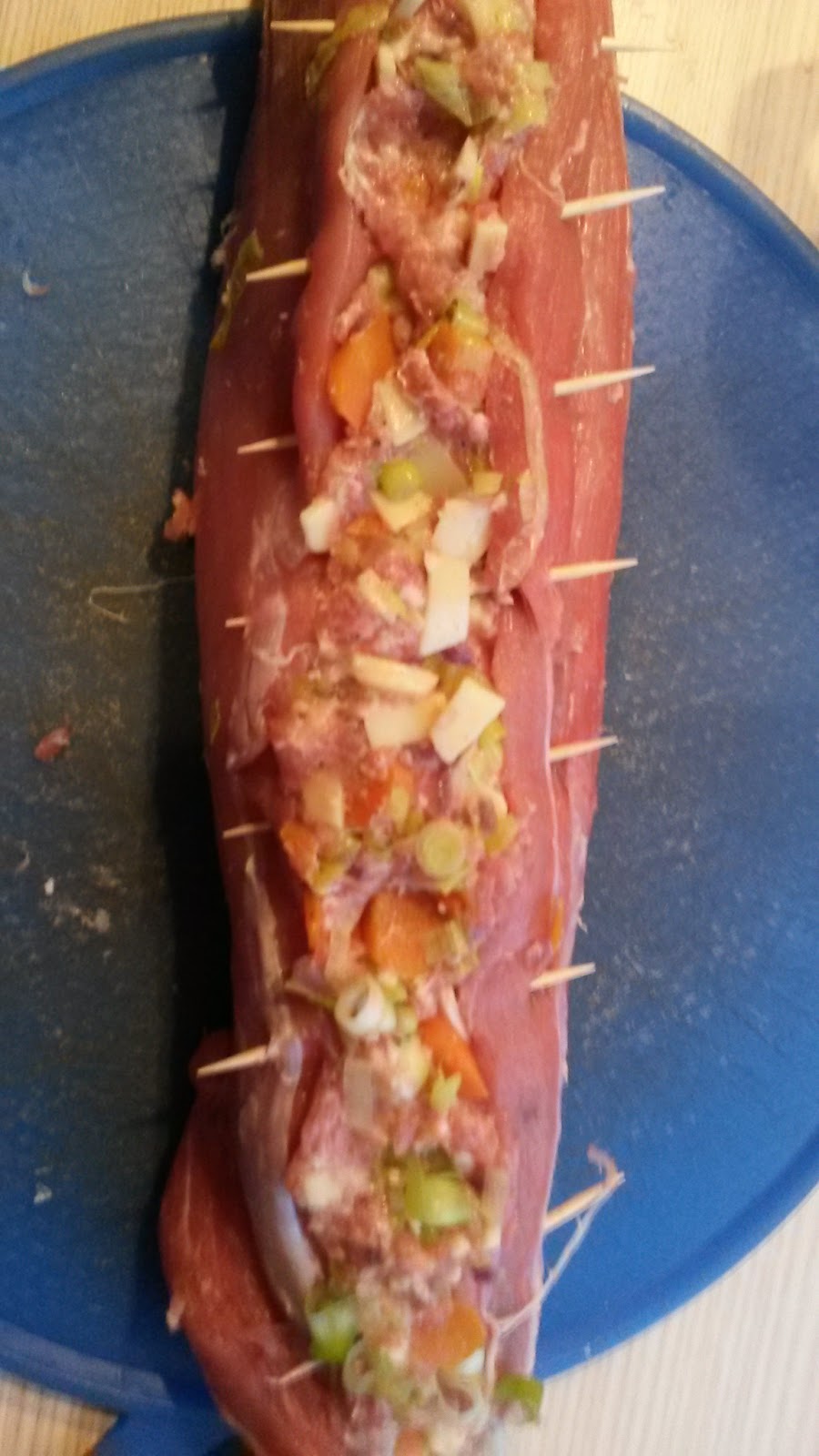Also, es gibt eine mit Bratwurstmett und Gemüse gefüllte Lende die im Brotteig gebacken wird.