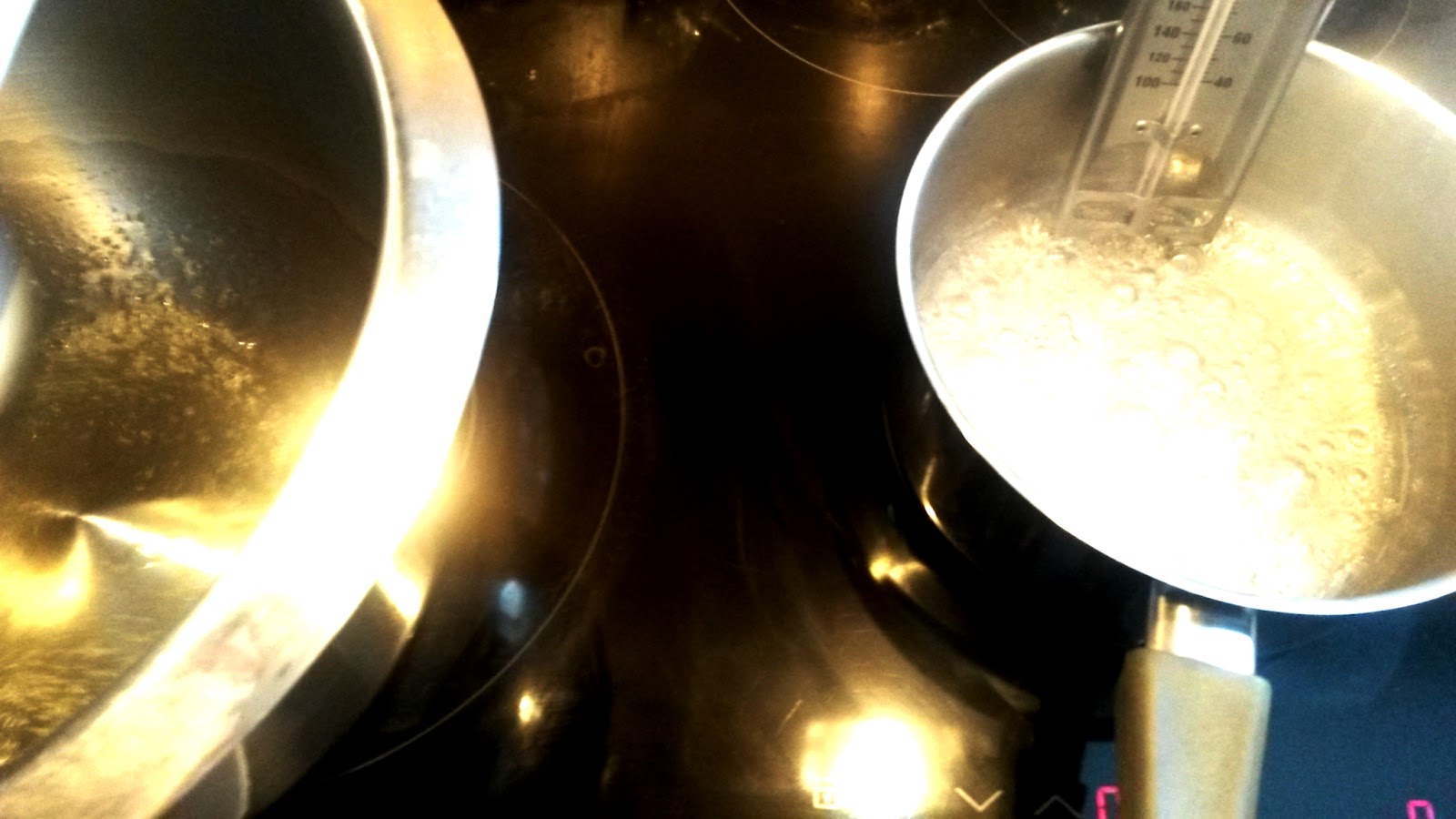Danach muss man das Zuckerwasser aufkochen lassen und bei 115°C sofort vom Herd nehmen und in das schon aufgeschlagene Ei geben. Hier ist es das Beste das Eiweiß mit einer Küchenmaschine aufzuschlagen, da man sonst noch ein paar Hände mehr bräuchte um alles koordinieren zu können.