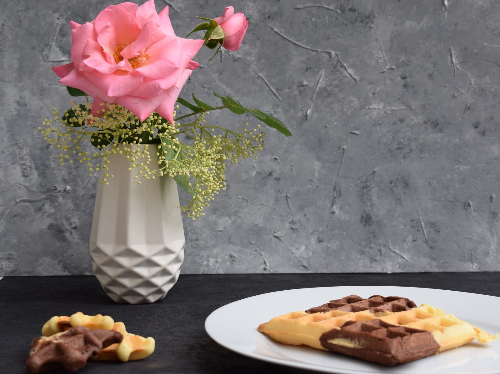 Für die Mamorwaffeln je zwei kleinere Teile weißen Teig und zwei Teile schwarzen Teig auf das Waffeleisen geben.