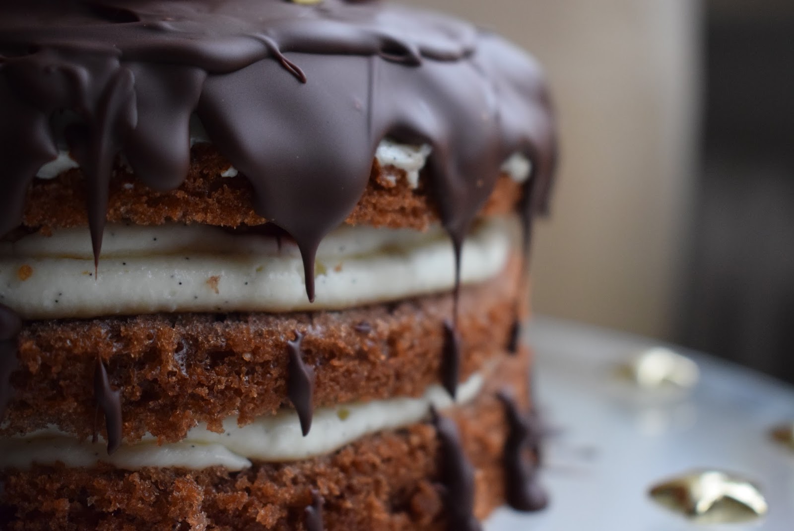 Dann durfte die Torte über Nacht in den Kühlschrank. Am nächsten Tag habe ich diese dann noch mit Schokolade überzogen, so dass ein Drip-Cake entsteht.
