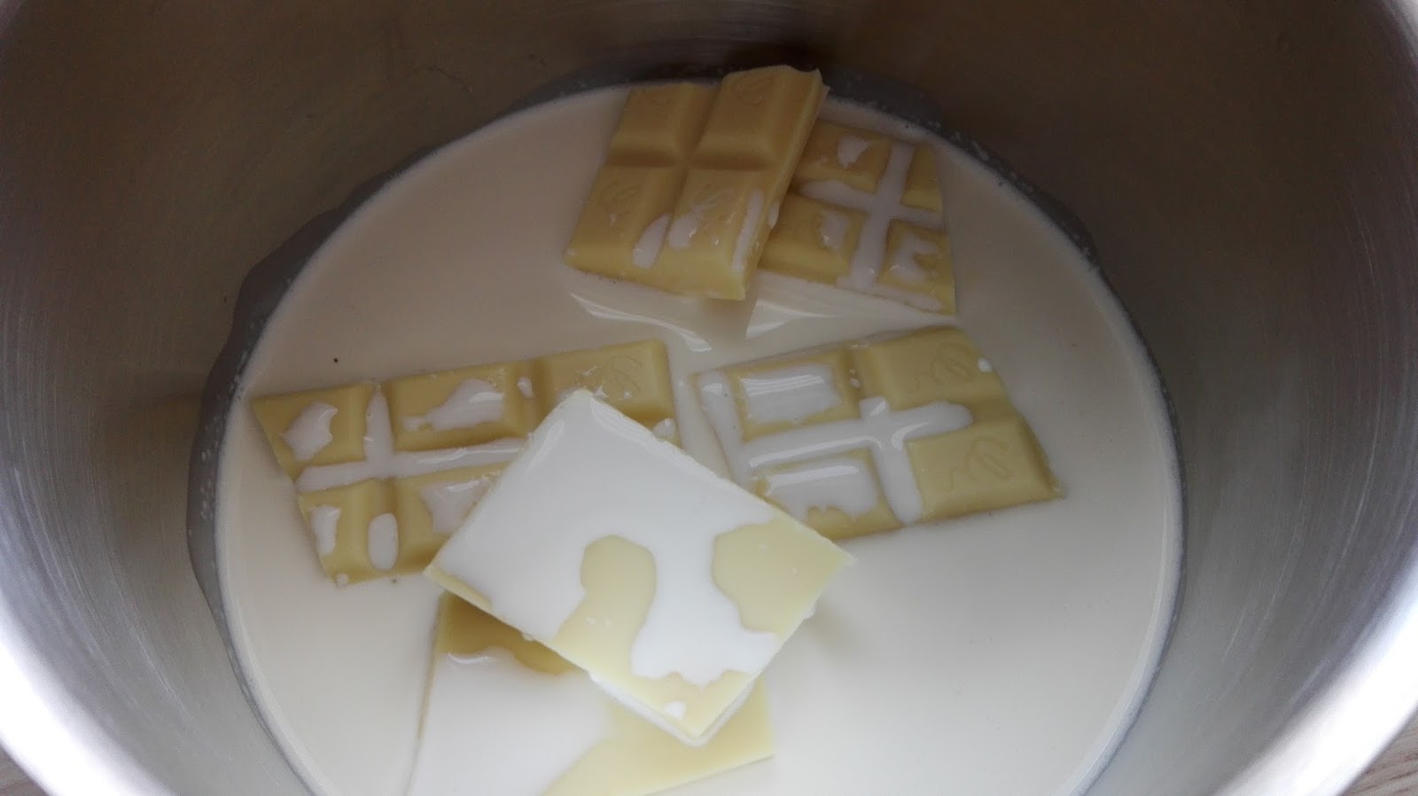 Für die Ganache die weiße Schokolade mit der Sahne langsam schmelzen. Wenn die Schokolade komplett aufgelöst ist, die Maße abkühlen lassen.