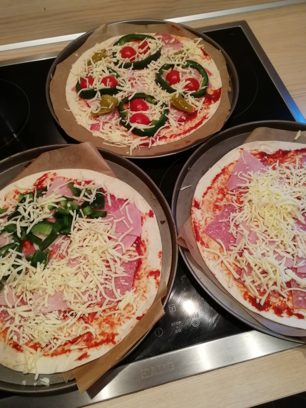 Bei uns gab es die Pizza klassisch mit Salami und Schinken sowie Paprika und Tomaten und ein paar Peperoni. Aber hier kann der Fantasie freien Lauf gelassen werden. Einfach drauf was schmeckt.