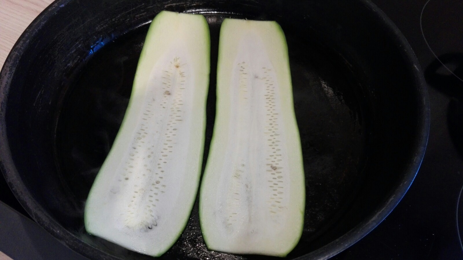 Die Zucchini-Scheiben mit Olivenöl in der Pfanne von beiden Seiten anbraten