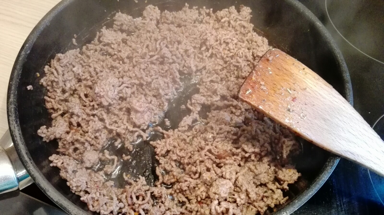 In der gleichen Pfanne dann das Hackfleisch krümelig anbraten.